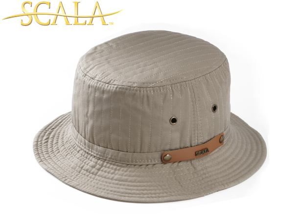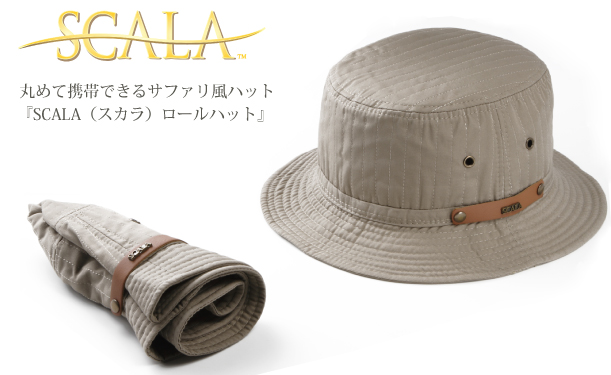 | クルッと丸めて牛革バンドで留めれば、バッグに忍ばせたり、ズボンの後ろポケットに差し込んで持ち歩けます。全体にステッチを入れることで、シワを防いで型崩れしにくいので、かぶる時も安心。 |